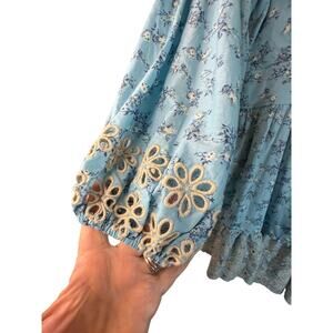 A Collective Story blue floral dress featuring a soft dusty blue base with delicate navy and ivory floral print throughout. Designed with a flattering V-neckline and covered button-front bodice, complemented by a defined empire waist for a feminine silhouette. Long balloon sleeves feature elastic cuffs with beautiful eyelet floral trim, adding romantic detail. The skirt is finished with a ruffled eyelet lace hem, creating lovely texture and movement. Fully lined through the body for comfortable coverage, with airy sleeves for a light, flowy feel. Pull-on style with an easy, flattering fit that works beautifully for everyday wear, brunch, or special occasions. Excellent condition. Colors and measurements may vary slightly due to lighting, screen resolution, or AI-generated rendering.