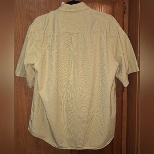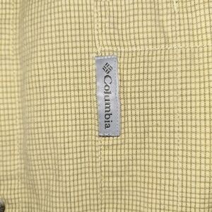 This is a Columbia men's short sleeve button-down shirt in a size large. It is a soft yellow with brown checkered. It features a single breast pocket. Ideal for work or play. Church, office, dinner dates, guys' night out, or everyday wear.