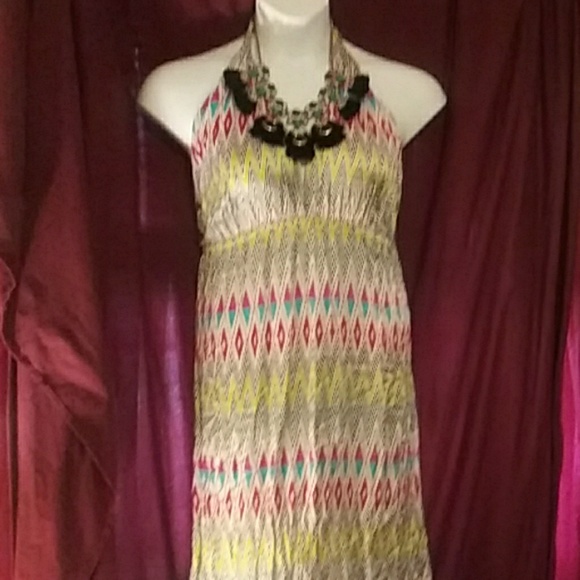 Boho chic in the late 90's...it has an empire elastizised back allowing a snug fit & a tie back. It's quite long/floor length I'd say that looks adorable w wedges or sandals - necklace sold separately