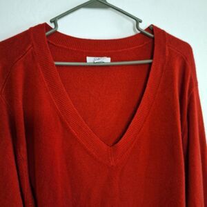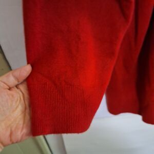 This is a very nice red sweater made out of a soft acrylic knit. It has a v-neckline, long sleeves, and is perfect for the office, or out for an evening. This should be more of a loose fit comfortable piece that could go with many different looks. This piece is 33" from pit to pit and 33" from shoulder to hem.