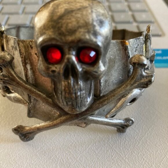 A Custom Made Skull & Crossbones Cuff Bracelet with red crystal eyes.