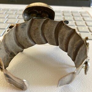 A Custom Made Skull & Crossbones Cuff Bracelet with red crystal eyes. My wrist is small. It's made of mailable metal so that it can bend slightly for a perfect fit very small like me or larger for a guy. There is some tarnishing due to years of overexposer to bus fumes near a window near Dekalb Ave, Brooklyn. I don't want to try to clean it for fear of not doing that correctly. It's a very cool piece that I received as a Christmas present years ago.