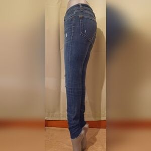pre-owned distressed denim jeans. see pictures. they are part of the description. raw hem. skinny pants. high rise. frayed ankle. inside thighs have some wear.