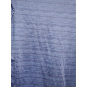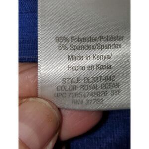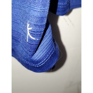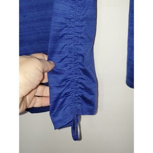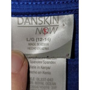 A pretty blue Danskin athletic top. This is long sleeved with rouching at the sides. 95% polyester and 5% spandex. This has a rounded neckline and is in excellent condition. 20" from armpit to armpit and 28" from shoulder to hem.