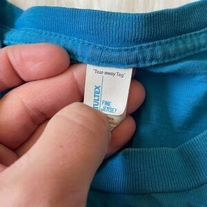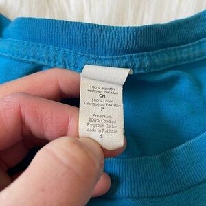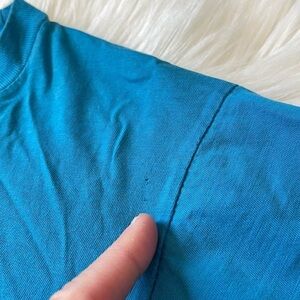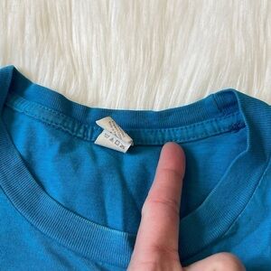 Good Condition! A few tiny holes on front and some light discolor under the arms/inner collar. See last few photos for details.