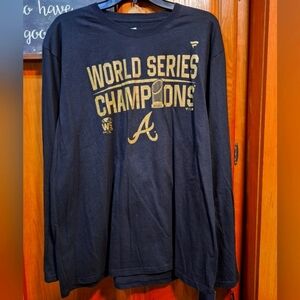 This is a Fanatics official Atlanta Braves World Series Champions long sleeve t-shirt in a men's size XL. It's new with tags with no flaws. Active, athletic, athleisure, sports, baseball, fanatic, casual, streetwear.