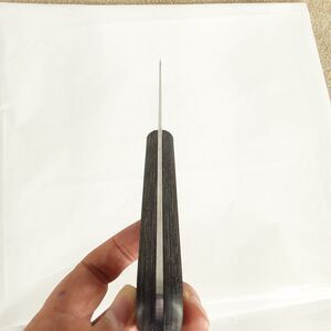 I like this medium weight knife. The handle is made of a dense, heavy wood. It feels very balanced in hand.
