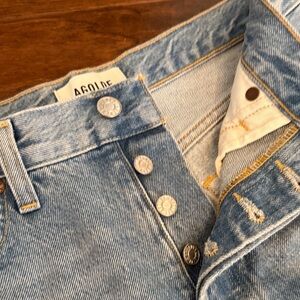 Stylish distressed denim shorts perfect for casual outings. Features a classic blue color with a trendy frayed hem. EUC
