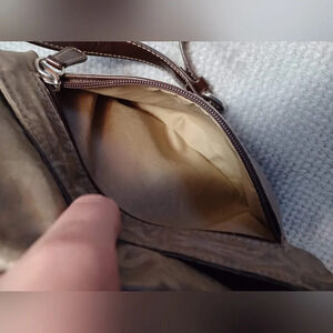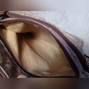 signature circle design lurex crossbody bag with matching coin purse by Giani Bernini. it's in very nice condition. brown pleather adjustable strap is with silver metal buckle / hoops. magnetic front clasp closure. fabric inside in nice condition with . 1 large roomy inside pocket. and 1 zipper pocket and 1 additional slide down into pocket with leather trim. 3 outer pockets in the front/ 2 outer pockets in the back. faux leather zipper pulls. some signs of love and wear. still in beautiful condition. see pictures. they are part of the description.