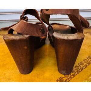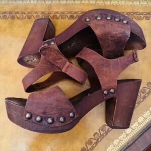A Giannetti Brown Leather Wood Stud Platform Clog Italian Boho Sandals