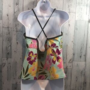 Floral print, dark green trim, removable straps, padded bra, tie center chest, smoke and pet free home, colors may vary due to lighting,good used condition, Sz: XL