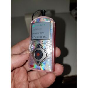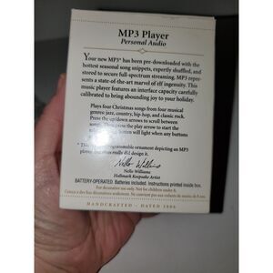 This is a neat little piece of nostalgia for your Christmas decor. It is an MP3 player that actually has 4 different songs to choose from and play. It takes 3 watch batteries and it has been tested and works as it should. The piece is 3" tall, 1.5" wide, has a red back with a reflective holographic snowflake front. You can scroll down to highlight and select which song you would like to play. This comes with the original box which is also in great condition. This will not come with the batteries.