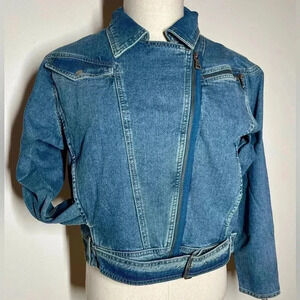 A Helm brand asymmetrical zip jean jacket with buckle detail, women’s XL. Features zippered sleeve cuffs, front chest zipper pocket and one chest flap pocket. Side hand pocket and pop collar.