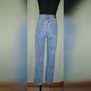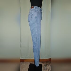 pinstriped blue denim jeans. Mom. high rise. see pictures. they are part of the description. pre-owned in great condition. faded.
