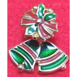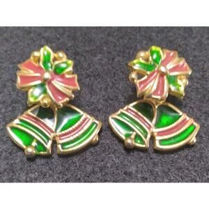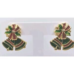 A I N Earrings Pierced Christmas Bow Bell Jacket Holly Red Green Goldtone Signed