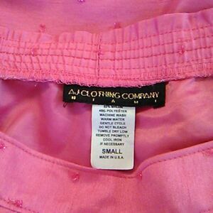 Made in the USA. Warm saturated pink makes this a keeper, and perfect for any special occasion. Jacket: French seams, beaded all over, slightly padded shoulders, button front, self rosettes. 20 inch sleeves. Fits comfortably over. Top: beaded all over, princess seams 39 at chest, 40 at bottom hem, little vents, 22.5 long from shoulder to hem. Pants: Cropped. 32-34 at waist, 41 at hips, 12.5 inch rise, 21.5 inseam. Beautiful color. Sparkly heels?