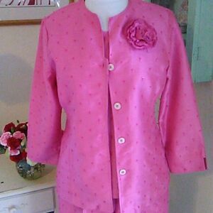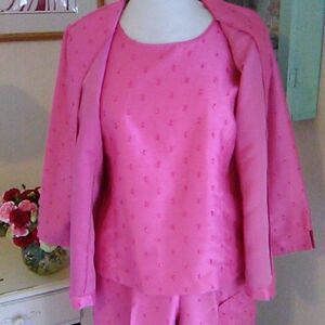 Made in the USA. Warm saturated pink makes this a keeper, and perfect for any special occasion. Jacket: French seams, beaded all over, slightly padded shoulders, button front, self rosettes. 20 inch sleeves. Fits comfortably over. Top: beaded all over, princess seams 39 at chest, 40 at bottom hem, little vents, 22.5 long from shoulder to hem. Pants: Cropped. 32-34 at waist, 41 at hips, 12.5 inch rise, 21.5 inseam. Beautiful color. Sparkly heels?