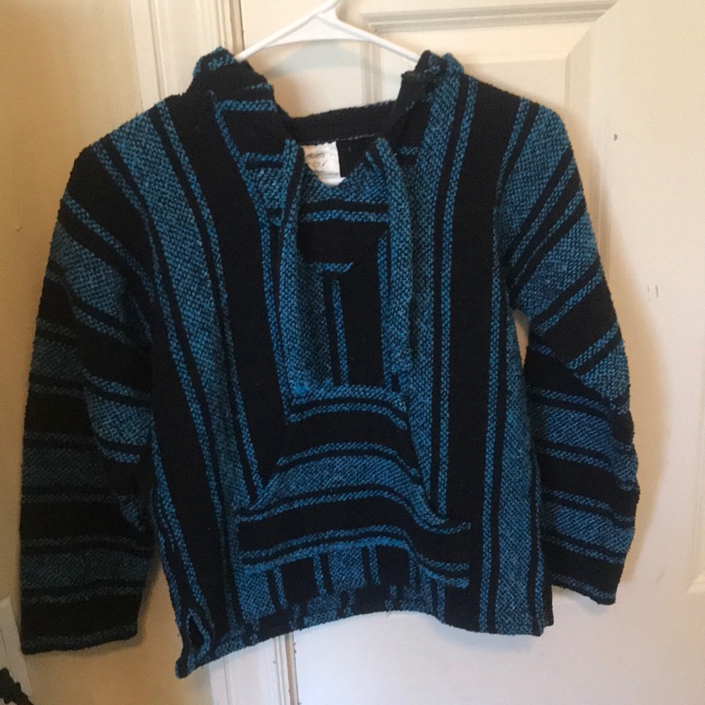 It’s a black and blue striped jacket with pockets