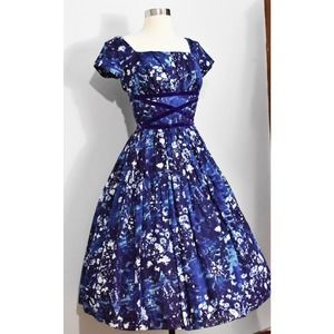 A Jane Parker Junior 50s Purple /Blue Patterned Dress with Velvet Waist Detail