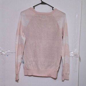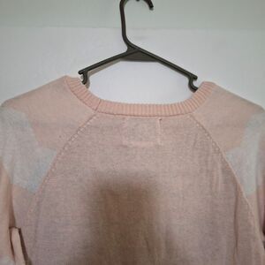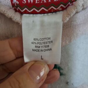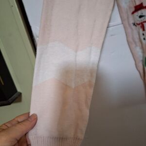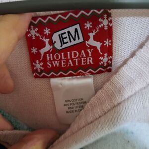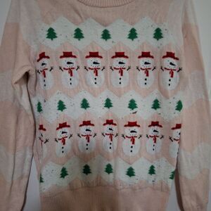 This is a Jem women's holiday sweater featuring snowmen and Christmas trees. It is mostly pink with white stripes and ribbed wrists and waistband. This is a very cute and happy piece for winter wear and perhaps the office. 60% cotton and 40% polyester this sweater is very soft. 20" from pit to pit and 25" from shoulder to hem