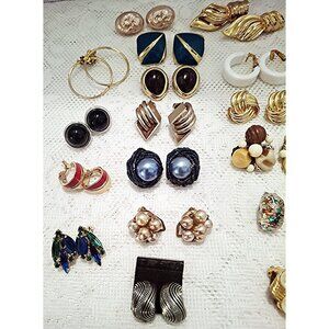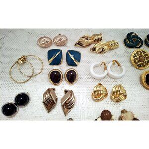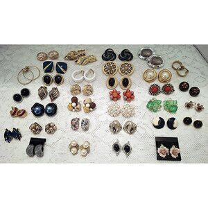 A LARGE LOT OF 34 PAIR OF VINTAGE EARRINGS. SIGNED PAIR INCLUDE, *CHRISTIAN DIOR*, *MONET*, *WEST GERMANY*, *AVON*, *ITALY*, AND *JAPAN*. THREE PAIR OF SCREW BACKS, THE REST ARE ALL CLIP-ONS.