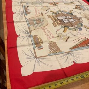 Elegant Hermes scarf with a red border. Features intricate cream and multicolor design. Perfect for adding a touch of luxury.