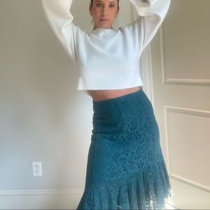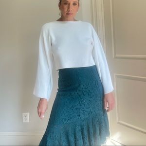 Purchased this skirt from the Anthropologie outlet- great quality fabric. Drops below knee fits like a true 6. Zipper on side.