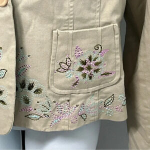 This is a cute embroidered floral, single button jacket. Cotton blend, stretch, lined, two pockets.
