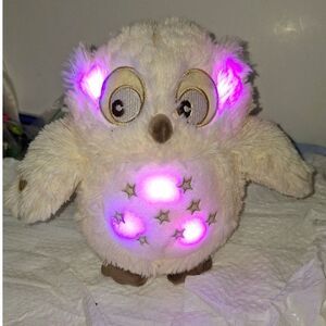 This adorable little plush owl will changed colors and play Twinkle Twinkle for 20 minutes to sing your child to sleep. All of the elements are sewn on, so safe for even very small children. He changes colors with or without the music playing. This little guy is 8" tall and in very good pre-owned condition.