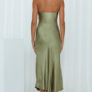 Worn once - An ankle length, silky khaki green dress which features a cowl neckline with a deep side slit. Perfect for fancy occasions.
