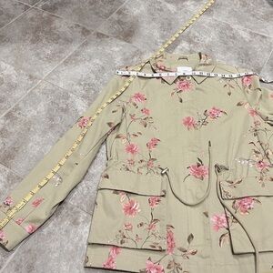 Introducing a beautiful floral jacket from A Loves A! The outer shell material is made of beige cotton with a pink floral pattern. It's versatile & unlined with a full zip & button closure, along with a cinched adjustable waist for a flattering custom fit.