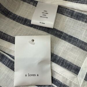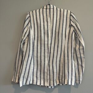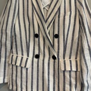 Stylish double-breasted blazer with navy and white stripes. Features button details and a classic fit.