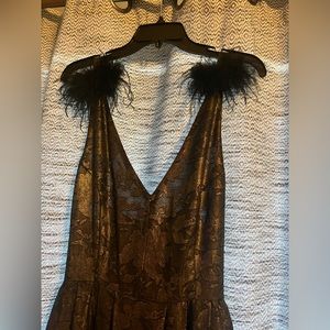 Very feminine gold dress. Had bought this to wear to a Mardi Gras themed party but went with a different dress. I could see this for a Roaring 20’s theme also. NWT. Top is somewhat sheer and straps are adjustable with feather detail. Very flattering and skirt is lined.