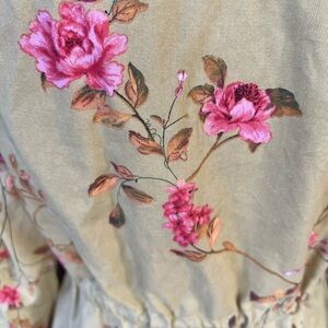 A Loves A ladies, light green pink floral, long sleeve, zip up jacket, size, medium, snap, and zipper closure, snap closure on the sleeves, brass colored accessories, drawstring at the waist, or you can make it smaller or larger too large front pockets, 100% cotton