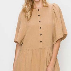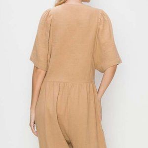 This front button-down volume short sleeve jumpsuit has a relaxed leg with a side pocket. This jumpsuit is comfy and stylish cotton gauze for an airy feel.
