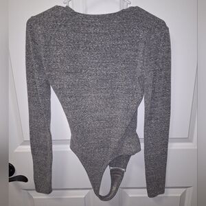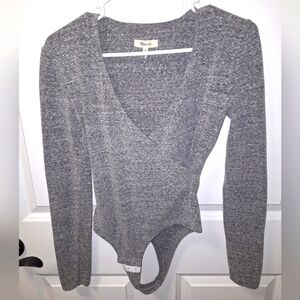 This is a Madewell bodysuit in a size XS. It's pre-loved and in great condition (see pics). It's a long sleeve with a v-neck. Sexy, flirty, easy wearing top. 16" PTP, 28" Length