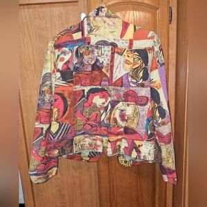 This is a Mirror Image linen blend Blazer in a ladies small. It's pre-loved and in great condition. Wearable art, artsy , colorful, pop, Picasso, blazer. 20" PTP, 22" length
