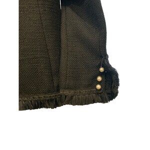 Elegant black jacket featuring pearl buttons, perfect for any occasion. This medium-sized jacket offers a chic and timeless style with its tailored fit, making it an ideal choice for fashion-forward individuals seeking both comfort and sophistication. Double breasted