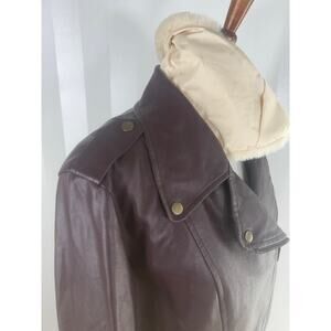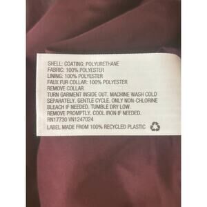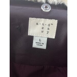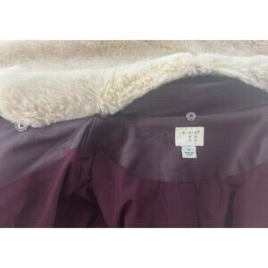 Super cute burgundy faux leather jacket features a front zipper closure and faux fur removable collar. It has long sleeves with zippers and front pockets with zipper closures. This jacket is fully lined. There is minor small tears on inside jacket by label. Please see picture for details. Don’t miss out on this A New Day jacket.
