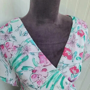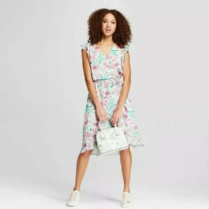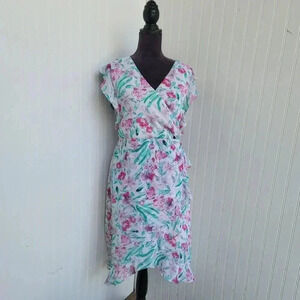 A NEW DAY Dress WOMENS FLORAL PRINT WRAP RUFFLE SLEEVES PINK Green Sz M D1