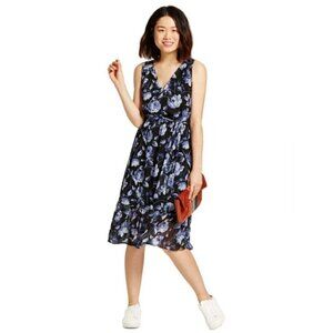 A NEW DAY Blue Floral Chiffon Ruffle V-neck A-Line Midi Dress