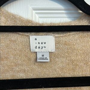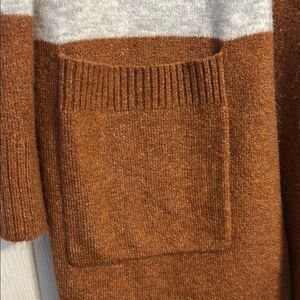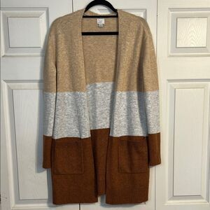 Size small A New Day colorblock open cardigan long length sweater / duster. This stylish cardigan features a clean color-block design in tan, rust, and gray, perfect for versatile layering. Made from a soft knit material, it offers a comfortable and modern look for any occasion. The open-front style adds a touch of elegance to your wardrobe. Two pockets in front. Long length is flattering on all body types.