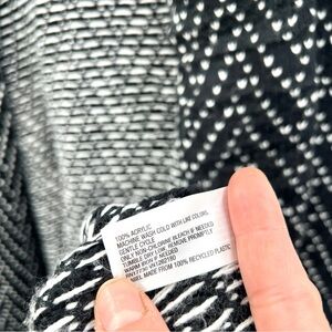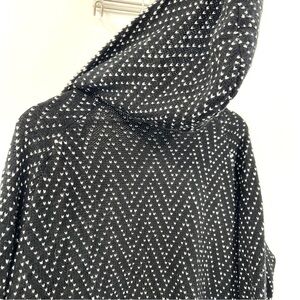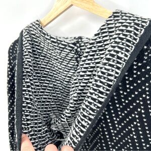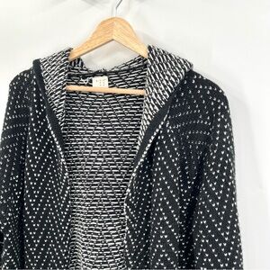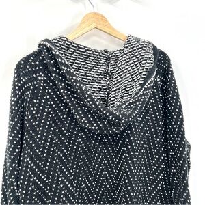 Stay cozy and stylish with this black and white hooded sweater. Perfect for layering and adding a chic touch to any outfit. There are a full pulls on the inside of the caridigan, but otherwise item is in good used condition. Great for casual or business casual attire. Knitted heart-shaped pattern. Item has pockets and a hood. Please see photographs for measurements and details.