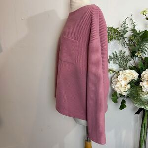 Soft rose pink ribbed long-sleeve top with a relaxed fit, featuring a chic single chest pocket for added texture and detail. Perfect for casual layering or a cozy standalone look.