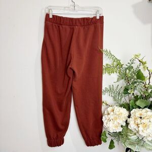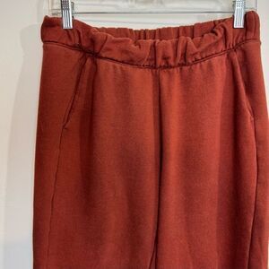 These rust-colored jogger pants feature an elastic waistband and cuffs for a comfortable, relaxed fit. Perfect for cuddling up and reading a book or getting on the yoga mat. Pockets! Ankle/crop length.