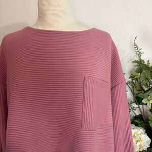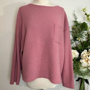 Soft rose pink ribbed long-sleeve top with a relaxed fit, featuring a chic single chest pocket for added texture and detail. Perfect for casual layering or a cozy standalone look.