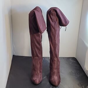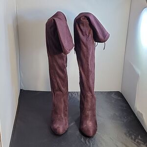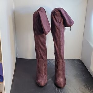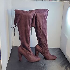 A NEW DAY OVER THE KNEE LENGTH ROUND TOE ZIP CLOSURE HIGH HEEL STILETTOS BOOT 9 1/2 COLOR PURPLE MADE WITH TEXTILE UPPER BALANCE MANMADE MATERIALS HEEL HEIGHT MEASUREMENTS APPROX 4"INCHED THIS ITEMS IS PRE-OWNED EXCELLENT CONDITION WITH ONLY LIGHT SIGNS OF WEAR IF ANY CHECK THE PICTURES