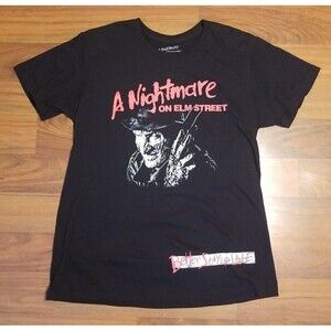 Get ready to scare your friends with this licensed A Nightmare on Elm Street T-shirt! This cotton shirt features a round neckline and short sleeves, with a solid black color and the iconic movie logo printed in graphic print. The shirt is designed with an athletic fit and is tagless for maximum comfort.