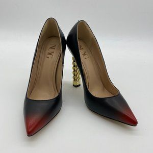 NUYG Women Gold Metal Chain Chunky High Heel Pointed Toe Slip On Fashion Pumps