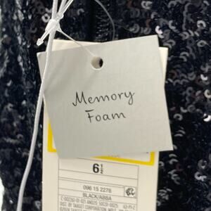 The A New Day Abba Black Sequin Covered Foldover Knee High Evening Boots in size 6.5 are a stylish and elegant option for formal events. These boots feature a pointed toe, stiletto heel, and black sequin accents for added glamour. The slip-on design with a zip closure and memory foam insole provides comfort and convenience. Made of polyurethane, polyester lining, and rubber outsole, these boots are perfect for weddings, parties, or any special occasions. Perfect for any season, these boots are a versatile and chic addition to any wardrobe.